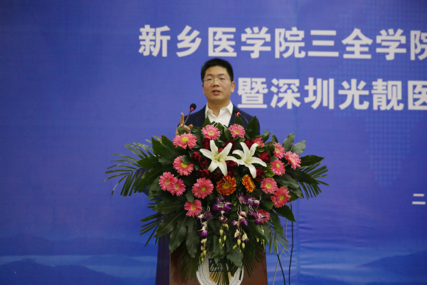 王志凯介绍我校基本情况并致欢迎词。他讲述了三全学院的创办历程、发展成绩及光明眼科学院成立的背景,并对来访嘉宾致以热烈欢迎。他指出,近年来,我校紧密围绕区域经济结构调整和产业转型升级,主动对接郑洛新自主创新示范区和国家创新驱动发展战略,坚持培养优秀应用型医学人才这条主线,优化学科专业结构,创新人才培养模式。学校在转型发展和产教融合方面走在了同类高校前列,光明眼科学院成立就是我校在深入贯彻“十九大”精神,深化教育领域综合改革背景下成立的首个行业学院。