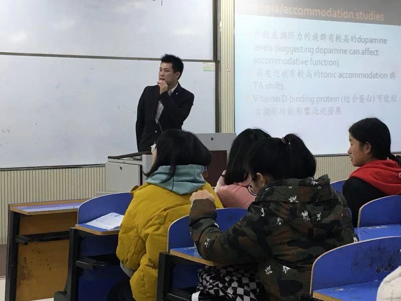 十点,讲座正式开始,元帅院长,李爽、胡文彦、陈波等老师出席讲座,现场百余名师生对杨博士的到来表示热烈的欢迎。杨博士先就自己的科研方向展开讲授,向同学们传授了自己的科研经验以及未来的科研方向然后杨博士向同学们简要介绍了国外验光初检流程,详细讲解了检眼镜在眼科检查与验光检查中的应用。最后,同学们就自己在学习科研过程中存在的问题向杨博士进行提问,杨博士都一一进行了解答,在同学们热烈的掌声中讲座结束。