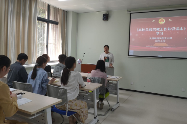 9月22日上午,光明眼科学院党支部组织全体教师在低视力实训室共同学习《高校民族宗教工作知识读本》,民族宗教工作事关党的执政基础,事关社会和谐、校园稳定,事关国家的安全,高校需要全面贯彻执行党的宗教政策和民族政策,重点防御境外势力利用宗教进行的校园渗透。