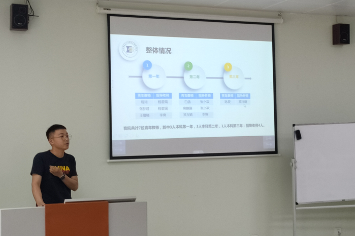 首先,由陈波老师进行我院本年度青年教师培养整体情况汇报,我院共计7位青年教师,其中3人本科第一年,3人本科第二年,1人本科第三年;指导老师4人。在学校的青年教师系统化培养方案基础上,我院制定新入职教师培养细则,第一年逐条至月,二、三年分模块培养;根据青年教师情况,院系将教研活动主要安排为集体备课、预试讲、科研培训,进行针对培养。
