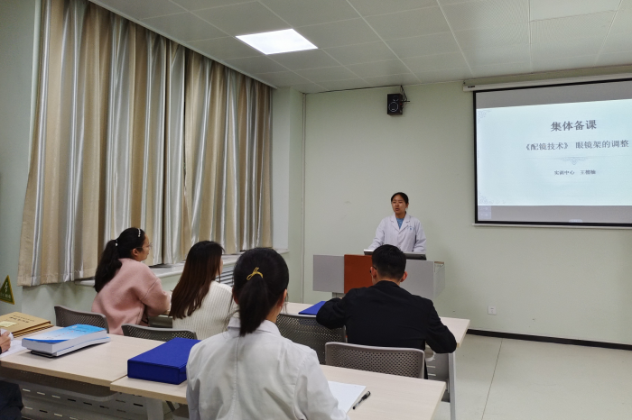 之后,教师陈波针对于20级专升本“眼镜的配发”进行集体备课,主要授课内容为:单光眼镜配发、双光眼镜配发、渐进多焦点眼镜配发、常见眼镜配发问题,并将重点放在配发时适配评估这一内容上,将配发时常见问题处理作为难点内容,对于重难点突破,陈波讲到:用实验镜架(变形)让学生真实体验,自主进行问题处理。