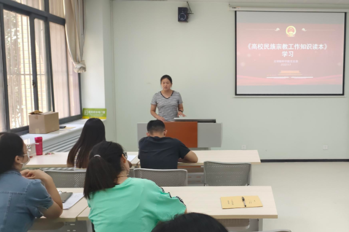 首先,党支部副书记张小欢组织全体教师集体学习《高校民族宗教工作知识读本》,张小欢强调,民族宗教工作事关党的执政基础,事关社会和谐、校园稳定,事关国家的安全,高校需要全面贯彻执行党的宗教政策和民族政策,重点防御境外势力利用宗教进行的校园渗透。