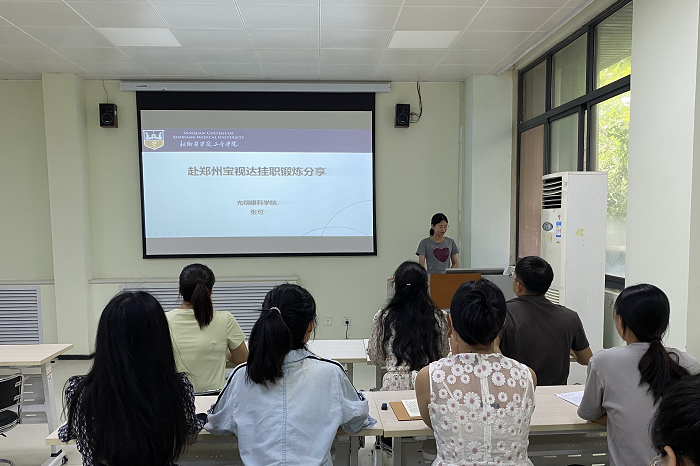 9月1日,青年教师暑期挂职锻炼分享会于在光明眼科学院A209举行。今年7月,我院操甲硕、张可、孟若飞老师于河南宝视达眼镜有限公司进行挂职锻炼学习。在挂职锻炼开始之前,学校及院系对我们提出了以下几点希望与要求:明确目的;学习相关专业的新知识、新技术、新工艺、新标准和发展趋势等;勤学好思。根据挂职单位的所见所学,调研挂职单位的人才需求,更新教学内容,改进教学方法,使教学与实践紧密结合,以利于不断提高应用型人才的培养质量;要切实做到挂实职,做实事,展现一名教师良好的素质、修养和昂扬的精神风貌;要切实加强自我管理,严格遵守相关制度,维护学校的荣誉形象。